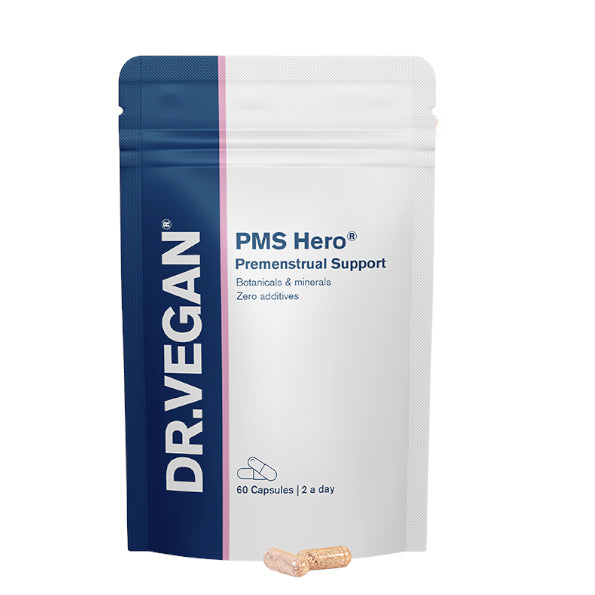 Dr. Vegan's PMS Hero is a carefully developed formula of clinically tested botanicals, and vitamins and minerals to relieve common pre-menstrual symptoms. Frequently reported symptoms include cramps, breast tenderness, bloating, mood swings and cravings. With 12 naturally sourced ingredients including Shatavari, Dong Quai, Bromelain, Chaste Tree, Folate and B Vitamins, PMS Hero helps balance your hormones to support a better mood, body and mind every day.