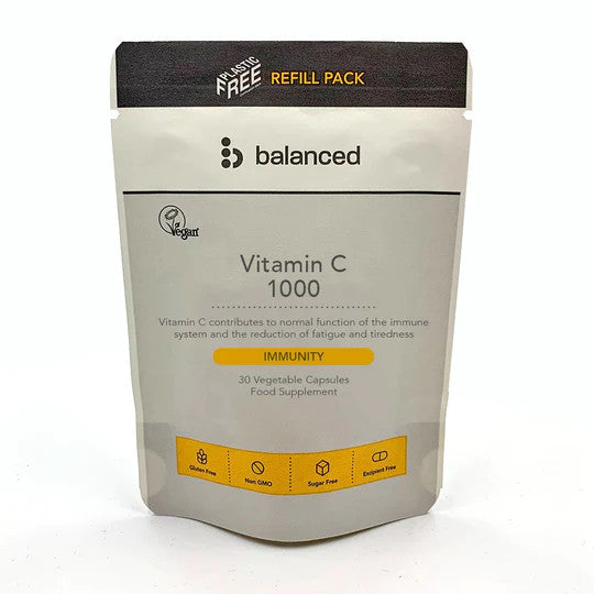 Balanced Vitamin C 1000 contains 1000mg of Vitamin C with Magnesium, Calcium and Rosehip, a rich source of bioflavonoids. Vitamin C contributes to normal nervous system and immune system function, and the reduction of tiredness and fatigue. It is an antioxidant required for the protection of cells from oxidative stress, and it plays a central role in collagen production which supports blood vessels, bones, cartilage and skin. This formula is vegan, free from excipients, allergens, GMO and sugar.