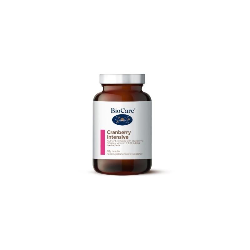Cranberry Intensive is a unique formulation for women containing a combination of cranberry, live bacteria and hibiscus extract along with vitamin C. Cranberry extract naturally contains components such as d-mannose, benzoic and quinic acid. Cranberries support immunity and the urinary system. Vitamin C contributes to the normal function of the immune system, supports collagen production and helps to protect cells from oxidative stress. Cranberry Intensive powder can be mixed with water to provide a pleasant tasting drink.  60g will provide support for 10 days.
