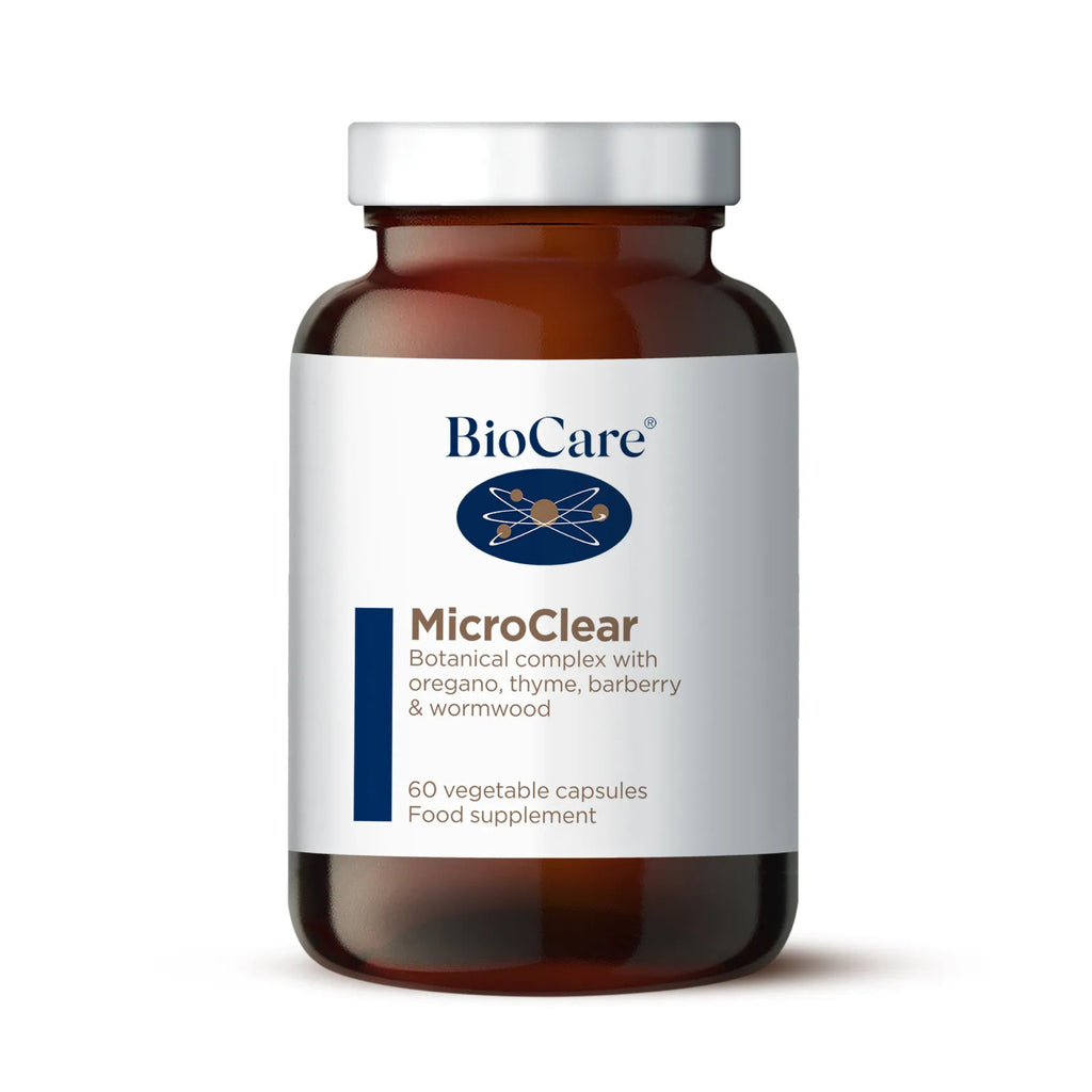MicroClear is a high potency complex of oregano, thyme, barberry, clove, olive leaf, wormwood, caprylic acid and grapeseed extract.  The ingredients promote the healthy function of the gastrointestinal tract as well as providing antioxidant and anti-inflammatory support.  The formulation also aids immunity and contributes to the health of the urinary and respiratory tracts. The plant oils in this supplement have been freeze-dried to reduce irritation to the gut and to promote absorption.