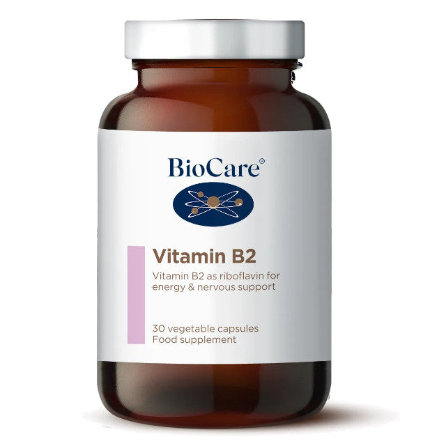 BioCare Vitamin B2 provides 50mg of riboflavin per capsule.  Vitamin B2 offers energy and nervous system support, helping to support mental health and performance, maintain hormone balance and to reduce fatigue.  Vitamin B2 is also required for iron metabolism.  This vegan B2 is free from allergens.