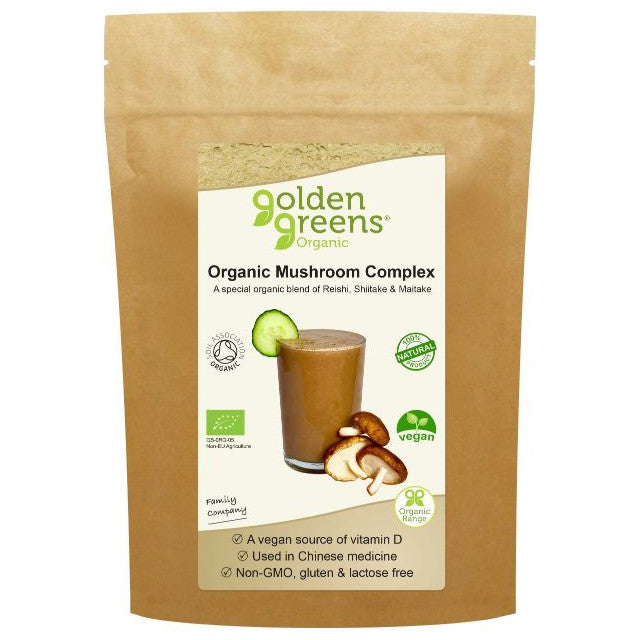 Golden Greens Organic Mushroom Complex is a unique combination of organic Reishi, Shiitake, and Maitake mushroom powders. This vegan food-source of Vitamin D helps to support bone and muscle health, calcium absorption, and contributes to the normal function of the immune system. Mushrooms are abundant in Beta Glucans, a soluble dietary fibre, which also supports healthy digestion and is associated with a lower risk of several chronic diseases. Each 5g serving provides 2.7g of fibre and 200IU of Vitamin D.