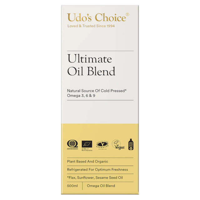 Udo's Choice Ultimate Oil Blend is an unique plant-based blend of organic cold-pressed seeds, delivering essential fatty acids Omega 3 & 6 in a 2:1 ratio for optimum health. This delicious oil contains flax, sesame and sunflower seeds combined with oils from evening primrose and coconut.
