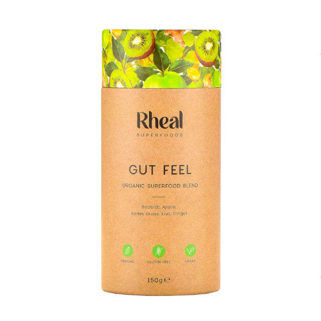Rheal Superfoods Gut Feel is your gut's best friend! This blend of natural prebiotic gut-friendly superfoods includes Baobab, apple, barley grass, kiwi fruit and ginger to support optimal nutrient digestion and absorption, to promote bowel regularity and to help reduce bloating. This nutritious and tasty powder is made using only natural, organic ingredients.  Mixed with water, it tastes like a fresh juice.