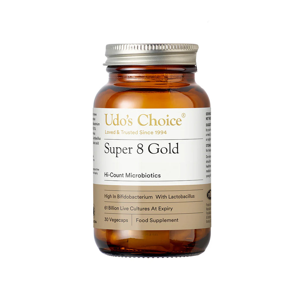 Udo’s Choice Super 8 GOLD Microbiotics is one of the strongest bacterial formulas available. It contains eight different bacterial strains found in the small and large intestines. The capsules contain 61 billion live bacteria cells and are high in Bifido bacteria which is especially useful for the health of the large intestine. Carefully formulated to survive stomach acidity, these capsules replenish the beneficial bacteria throughout your whole digestive tract.