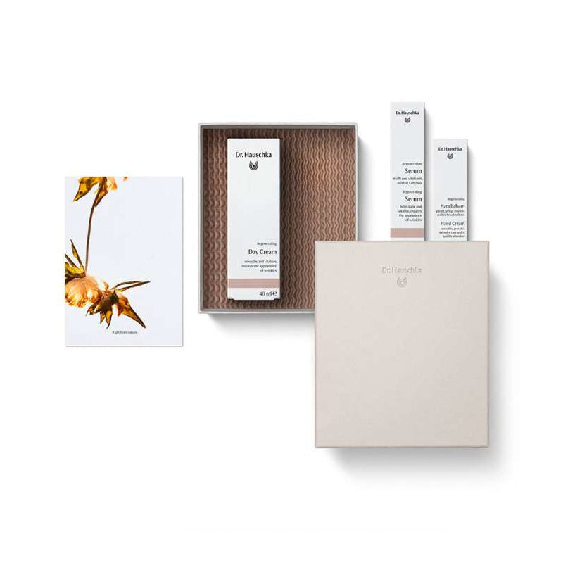 Give the gift of radiant renewal with the exclusive Warm Glow gift set from Dr. Hauschka. Specially curated for mature skin, this elegant trio is designed to restore vitality, smoothness, and resilience with every application. Each product from the regenerating range is infused with the finest botanicals to deeply nourish and support the skin’s natural regenerative processes. The hand cream is a rich blend of olive and avocado oils, cocoa butter and plant extracts helping to maintain elasticity and hydration throughout the day. The day cream effectively smooths and stabilises the complexion, while minimising the appearance of fine lines and wrinkles. Completing the set is the regenerating serum, a lightweight yet potent formula that tones, balances and refines your complexion. Available for a limited time only, the Warm Glow gift set is a celebration of care, comfort, and timeless beauty.